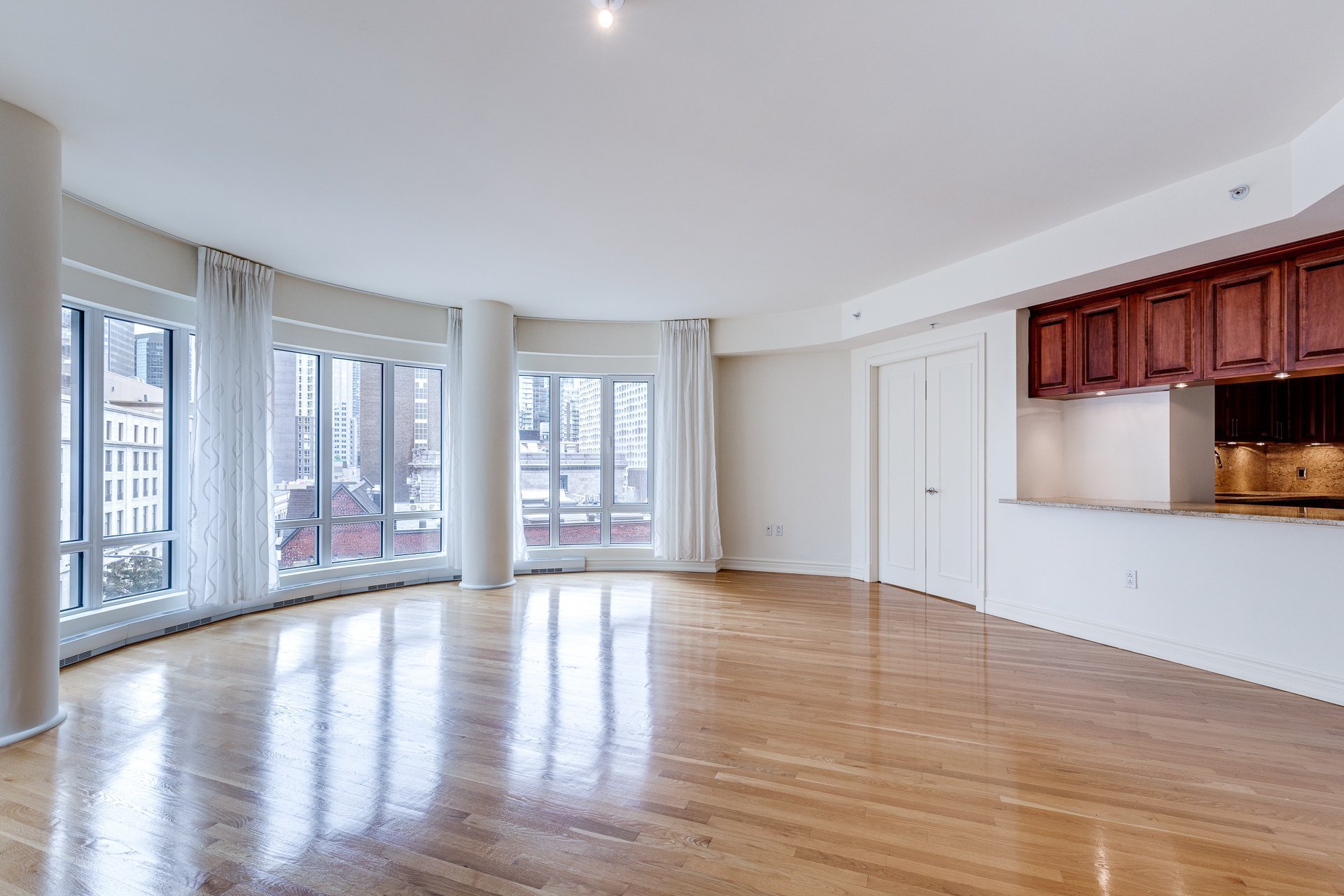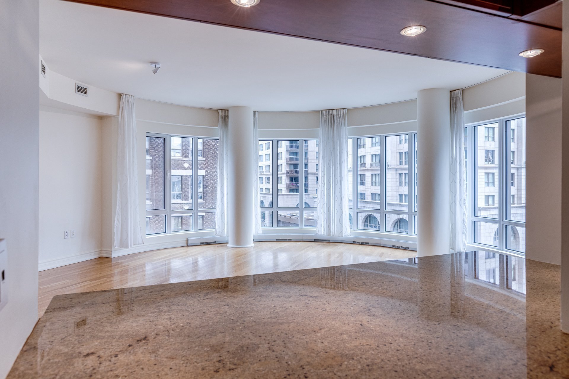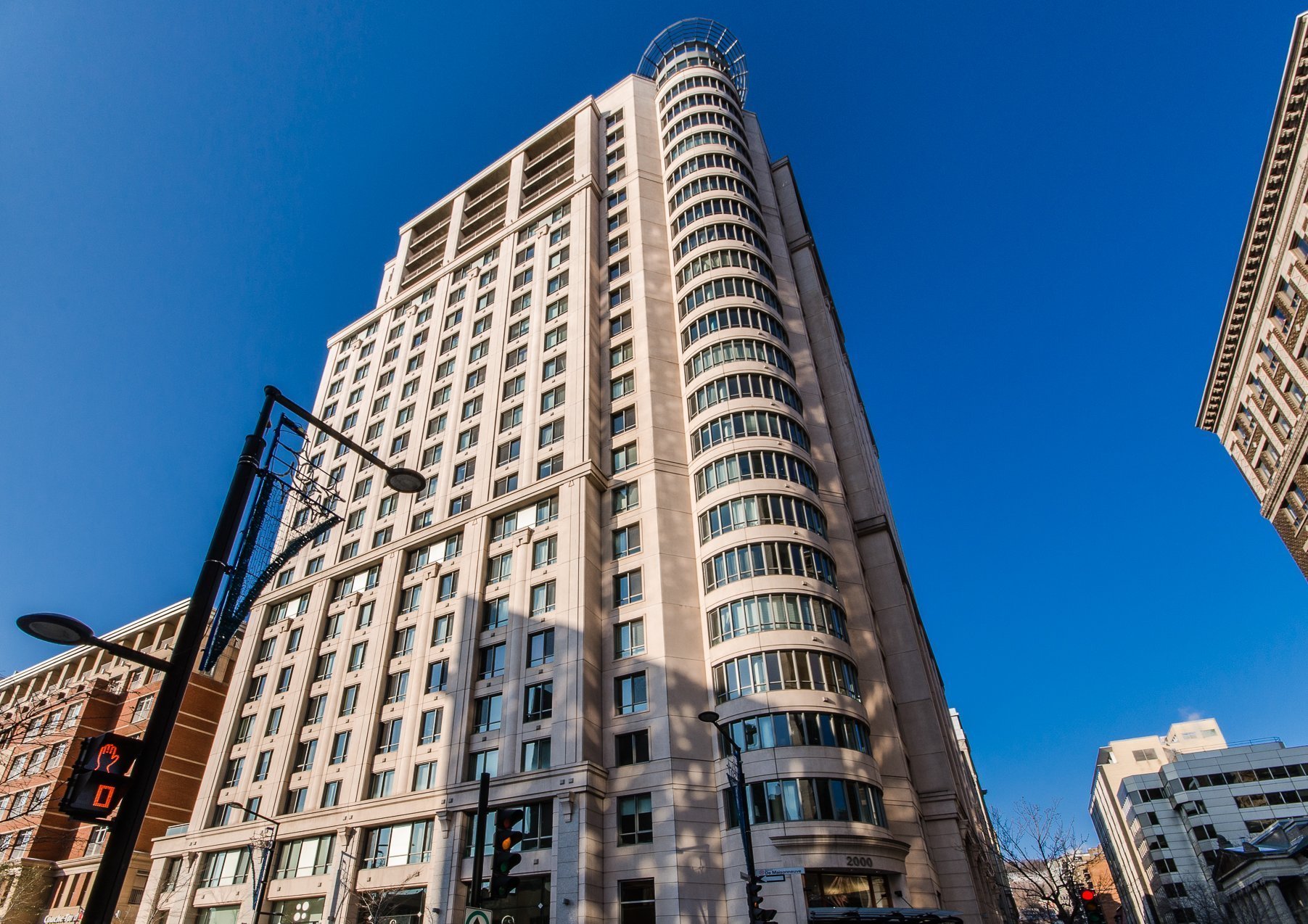 Luxury 2-bedroom residence with view in the prestigious 'ROC FLEURI', in the Golden Square Mile of downtown. This stunning unit, with its beautiful semi-circular window, is flooded with light. Quality finishes combined with a spacious layout, excellent amenities and ideal location, are sure to please even the most discerning resident. Note: The A/C compressor in the apartment was recently replaced. Features of the building: 24/7 doorman, Valet, Indoor pool, fabulous outdoor lounge area, gym with spa-like changing room, reception hall, Garage & Locker included. Well managed complex in great central location. Immediate occupancy!